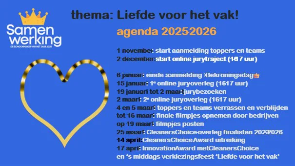 Ieder schoonmaakbedrijf of eigendienst, met enkele tot duizenden medewerkers, kan zijn of haar schoonmaker én schoonmaakteam aanmelden. Een topper en/of team die met trots het vak beoefent én uitdraagt. Kijk bij verkiezing voor de spelregels van inschrijven en meld jouw schoonmaker en/of team aan. In kwartaal 4-2025 start de inschrijving tot 6 januari 2026.