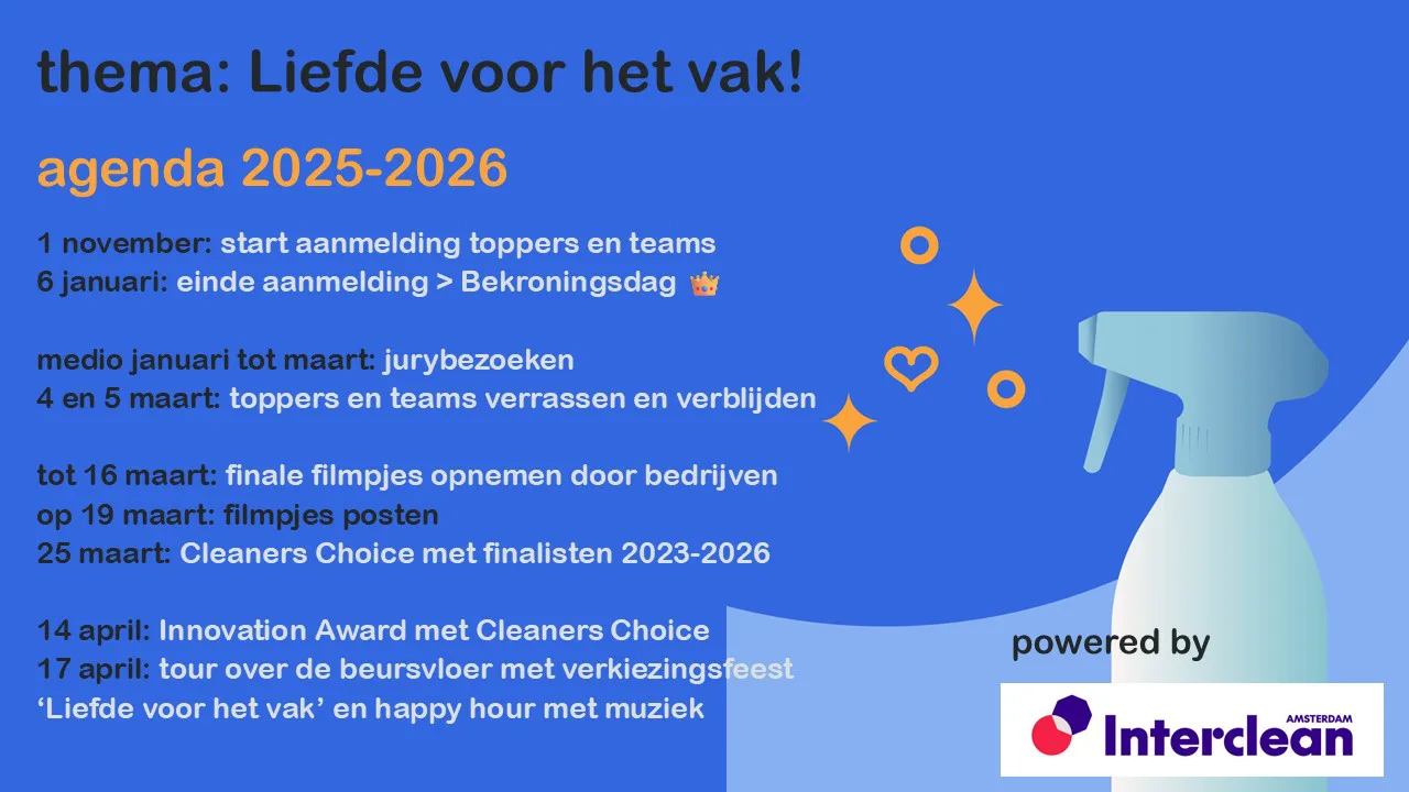 Ieder schoonmaakbedrijf of eigendienst, met enkele tot duizenden medewerkers, kan zijn of haar schoonmaker én schoonmaakteam aanmelden. Een topper en/of team die met trots het vak beoefent én uitdraagt. Kijk bij verkiezing voor de spelregels van inschrijven en meld jouw schoonmaker en/of team aan. In kwartaal 4 2025 start de inschrijving voor 2026.